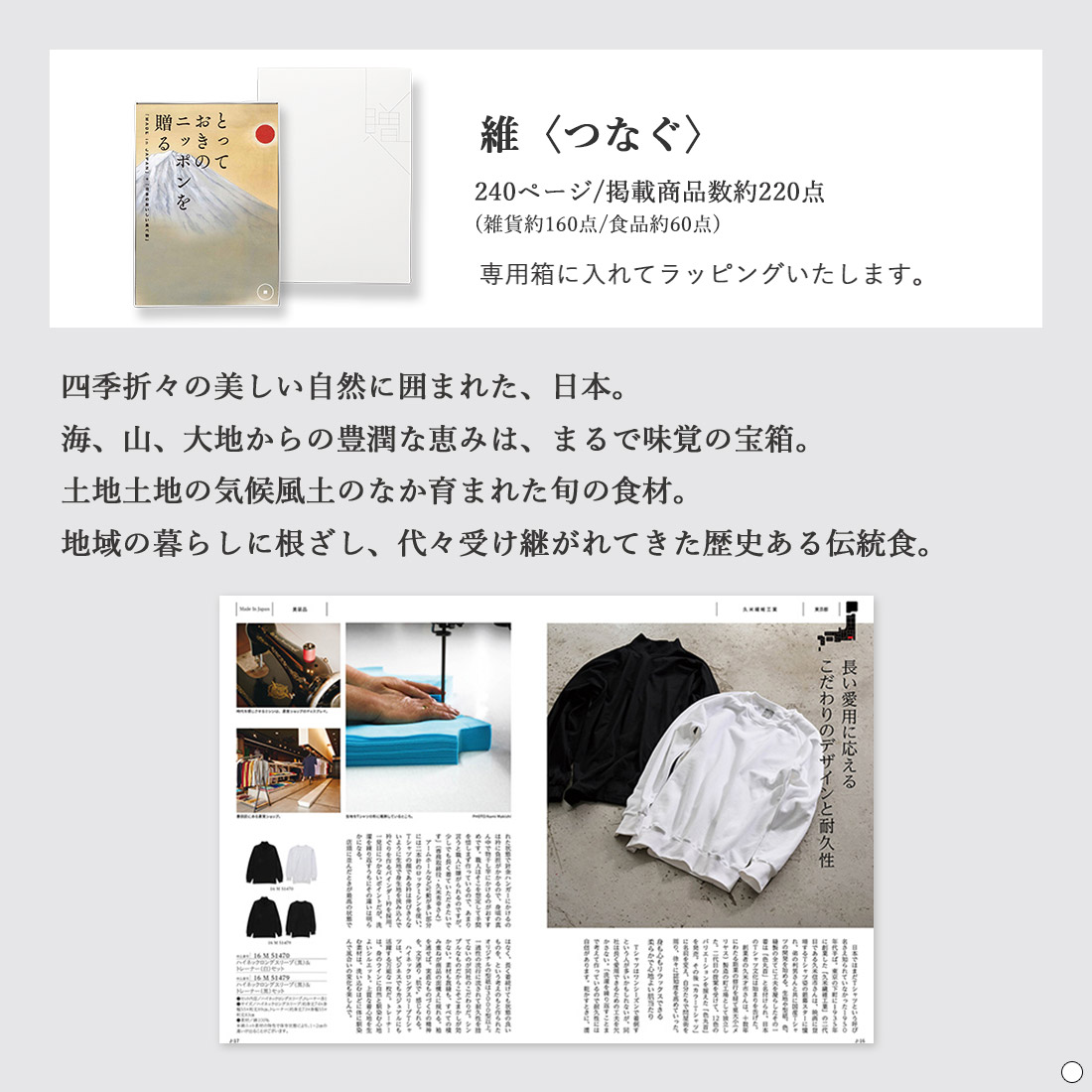 | 掲載アイテム例 | 一輪挿し / 剪定鋏 / ロックグラス / 江戸櫃 / 湯たんぽ / 豆皿 / つげブラシ / 化粧筆 / 爪切り / パールネックレス / 肥後象嵌ネックレス / ベルト / 革小物 / トレーナー / ロングスリーブTシャツ / かや生地製品 / 三河木綿製品 / ワンショルダートートバッグ / ショルダーバッグ / ボディバッグ / レザーポーチ / キーケース / 麦わら帽子 / 甲州印伝 / 江戸小紋 袱紗 / 高島ちぢみ / 漆塗りアクセサリー / スカーフ / 長財布 / 青森ヒバ製品 / ルームシューズ / バスマット / 今治タオル / 小座布団 / 炭フォームピロー / 阿波しじら織 / 棕櫚製品 / い草キッチンマット / 靴べら / めだか鉢 / フォトフレーム / 箱根寄木細工 フリーラック / 美濃和紙 スタンドライト / ダストボックス / 万年筆 / ガラス製花器 / 木製花器 / 地球儀 / 奈良墨 / 積み木 / 木製おもちゃ / ベビー用肌着 / 洋服ブラシ / 靴磨きセット / ブランケット / ルーペ / 風鈴 / ロックグラス / ワイングラス / ショットグラス / 豆皿 / ステンレスタンブラー / 酒器セット / 曲げわっぱ / 箸置き / 茶筒 / 茶杯 / 木椀 / コーヒーサイフォン / 琺瑯片手鍋 / 急須 / / 土鍋 / まな板 / 包丁 / フライパン / 卓上鍋 / 鉄釜 / そばちょこ / 萬古焼 / 砥部焼 / 益子焼 / 九谷焼 / 備前焼 / 萩焼 / 鍋島焼 / 美濃焼 / 波佐見焼 / 耐熱ガラスコンテナ / シェラカップ / 弁当箱 / 八重山みんさ織 / シーサー置物 / 生鮮品 / 惣菜 / 保存食 / 調味料 / 菓子 / 飲料 / 酒 / 器と道具 |
