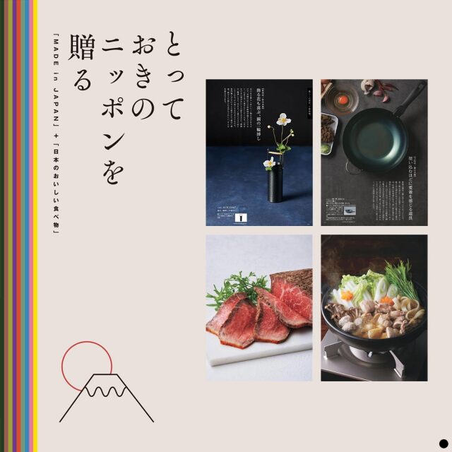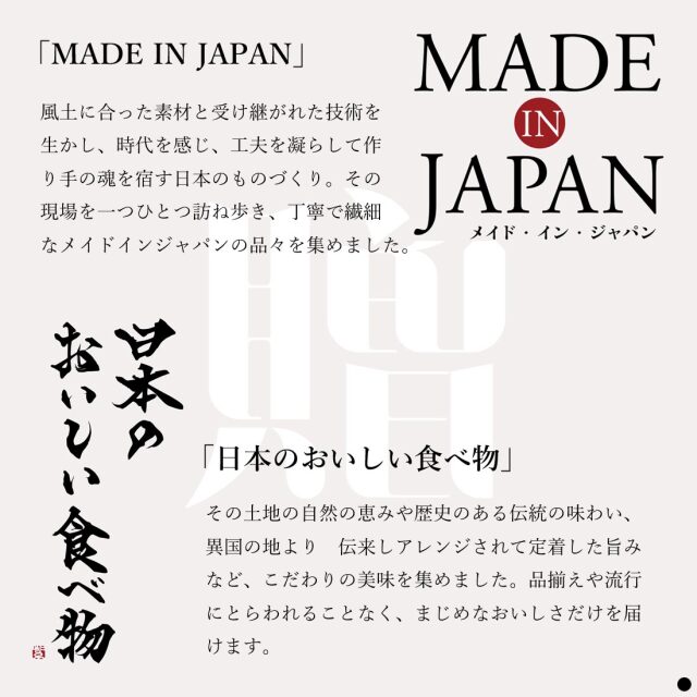 | 掲載アイテム例 | 江戸櫃 / かき氷機 / 洋服ブラシ / つげブラシ / 化粧筆 / パールネックレス / 肥後象嵌ネックレス / ベルト / 革小物 / 札入れ / スモールウォレット / ルームウエア / かや生地製品 / 小倉織 / 帆布トートバッグ / ナイロントートバッグ / デイパック / ショルダーバッグ / ソフトハット / 甲州印伝 / 結城紬 ショール / アクセサリーポーチ / スカーフ / 名刺入れ / 長傘 / オーナメント / 飾り皿 / コートハンガー / 今治タオル / スタンドライト / 小座布団 / マットレス / 枕 / 炭入り枕 / 棕櫚製品 / ラック / い草インテリアマット / 靴磨きセット / 手文庫 / ガラス製花器 / 地球儀 / 積み木 / 傘立て / 洋服ハンガー / ボディブラシ / ルームシューズ / 酒器セット / 薩摩切子 / 曲げわっぱ 椀 / 茶杯 / 深鉢 / 飯碗 / 山中塗 / 箱根寄木細工 / 南部鉄瓶 / 琺瑯パスタパン / 包丁 / フライパン / 卓上鍋 / 両手鍋 / ドリップポット / 銅製ケトル / 鉄釜 / 益子焼 / 九谷焼 / 清水焼 / 有田焼 / 鍋島焼 / 萩焼 / 清水焼 / ゴブレット / サコッシュ / 八重山みんさ織 / タンブラー / 紀州高田果園 / 壱岐牛 / 松阪牛 / 石井味噌 / 高野屋 / とらふぐ / 花咲がに / 静岡県産うなぎ蒲焼 / 土佐あかうし / 北海道ジンギスカン / 田嶋ハム工房 / 塩瀬総本家 / 芳翠園 / 鹿児島県産黒毛和牛 / 神戸牛 / ヤマカ水産 / 天たつ / オオハシ商店 / キッチンハンズ / 日本橋 古樹軒 / 京都産朝掘り竹の子 / 奥の松酒造 / ルミエール / 勝山酒造 |